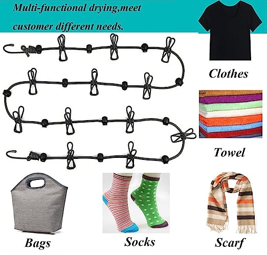 Stretchable Cloth Drying Rope with 12 Clips (9 Feet, Multicolour)